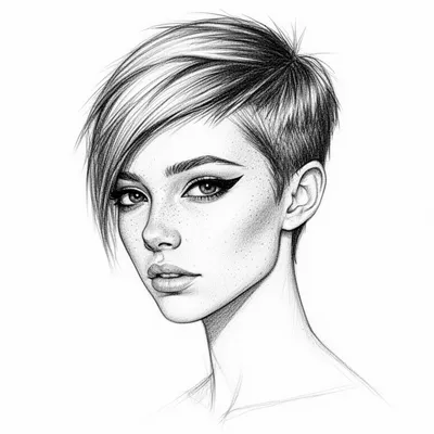 SketchPrecision technical pen sketch avatar featuring a young woman with asymmetrical pixie cut and sharp eyeliner, rendered in elegant fine-line illustration style.