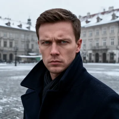 RealisticDetailed AI-generated avatar of a young Polish man in a navy wool overcoat, featuring sharp Slavic features and brooding expression against a snowy European cityscape.