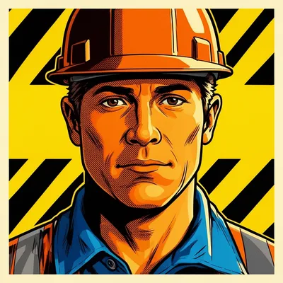Pop ArtBold graphic AI avatar depicting a stylized construction worker portrait in vibrant pop art style with halftone orange tones and industrial design elements.