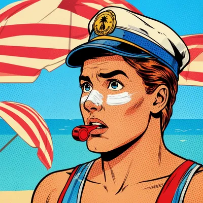Pop ArtBold, vibrant pop art style AI avatar of a lifeguard with sunscreen, halftone face, and beach-inspired graphic design for creative profile imagery.