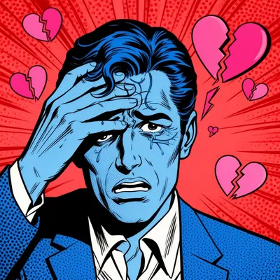 Vibrant comic book-style AI avatar featuring a heartbroken man in blue halftone with dramatic emotional expression, perfect for bold digital profiles.