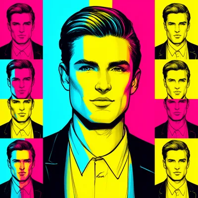 Pop ArtTrendy graphic design AI avatar featuring sleek male portrait in bold CMYK colors with Warhol-inspired pop art style and dynamic visual impact.