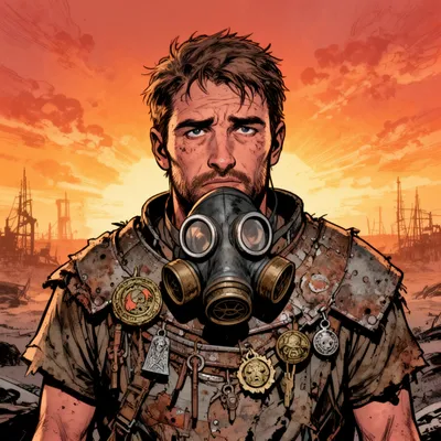 Comic BookGritty comic book style AI-generated avatar of a resilient post-nuclear wasteland survivor with gas mask, scavenged armor, and intense survival aesthetic.