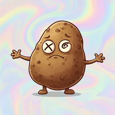 Whimsical cartoon AI avatar featuring a bewildered lumpy potato creature with crossed spiral eyes and tiny spread arms against a psychedelic pastel background.