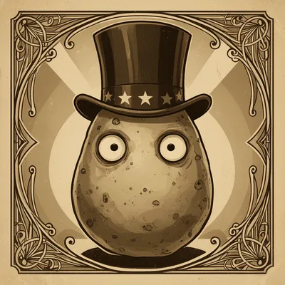 Unique AI-generated avatar featuring a whimsical potato monster in vintage Art Deco style with mysterious magician expression and theatrical flair.