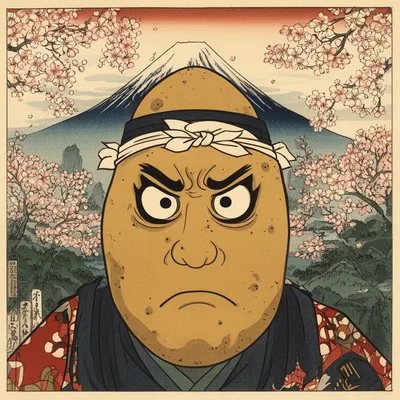 Fierce Japanese-inspired AI avatar of a potato monster warrior in traditional ukiyo-e woodblock print style with bold eyes and samurai aesthetic.