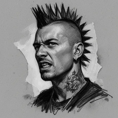SketchIntense charcoal sketch avatar with mohawk and neck tattoo, featuring raw artistic expression and rebellious punk-inspired graphical portrait design.