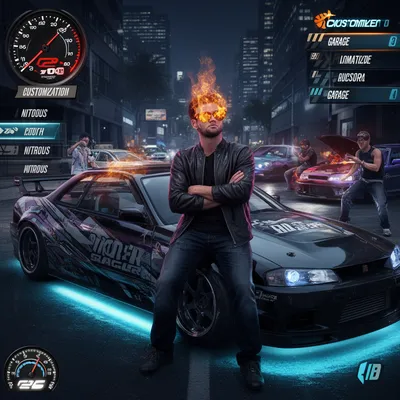 GamingHigh-octane AI gaming avatar featuring a confident street racer with custom car, sunglasses, and urban nighttime racing atmosphere for profile graphics.