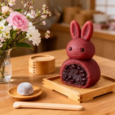 MonstersAdorable red bean creature avatar in whimsical Japanese wagashi style, crafting sweet azuki-filled daifuku with playful cartoon monster charm.