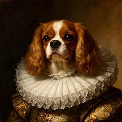 PetsElegant AI-generated avatar featuring a Cavalier King Charles spaniel in a Renaissance portrait style with chiaroscuro lighting and noble posture.