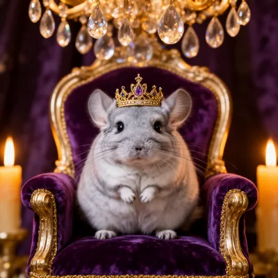 PetsWhimsical AI-generated pet avatar featuring a fluffy silver chinchilla in a tiny crown, sitting regally on a purple velvet throne with elegant golden details.