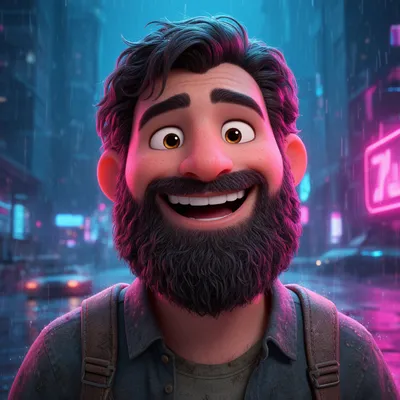 High-detail 3D render avatar with thick dark beard, warm eyes, and vibrant neon cyberpunk styling perfect for profile and gaming platforms.