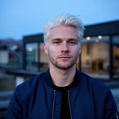 Modern AI-generated avatar featuring a young Swedish man with platinum blonde hair and light stubble, wearing a navy bomber jacket against a minimalist Nordic background.