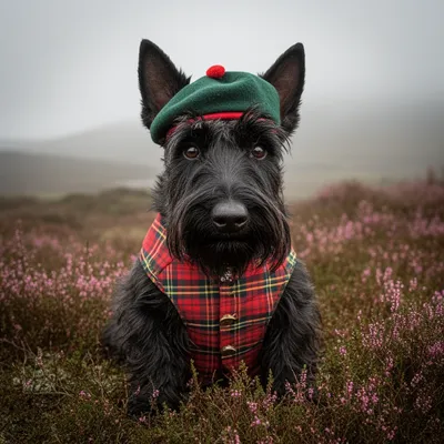 PetsCharming AI-generated Scottish terrier avatar in traditional tartan vest, capturing classic breed personality with highland-inspired heritage styling.