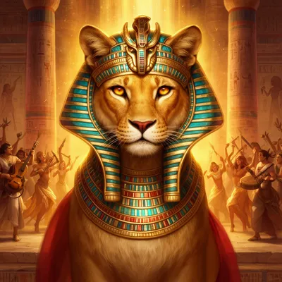 MythicalAncient Egyptian divine avatar transforming fierce Sekhmet into peaceful Hathor, featuring golden lioness features, amber eyes, and ethereal festival temple lighting.