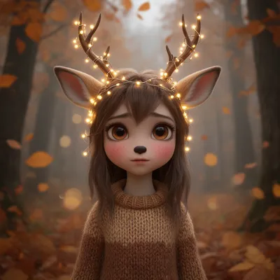 3D RenderEnchanting 3D render of a shy deer-girl avatar with delicate antlers, fairy lights, and warm autumn forest background. Soft fantasy character design.