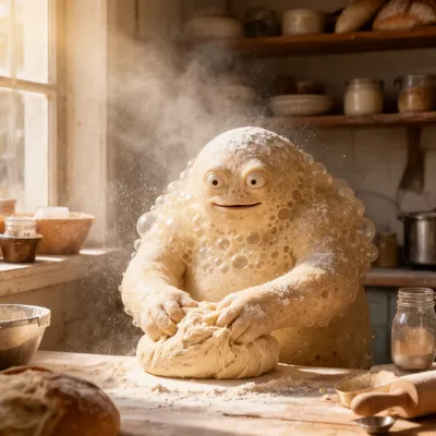 MonstersPlayful AI-generated avatar featuring a bubbly, flour-dusted sourdough creature kneading bread in a rustic farmhouse kitchen with soft morning light.