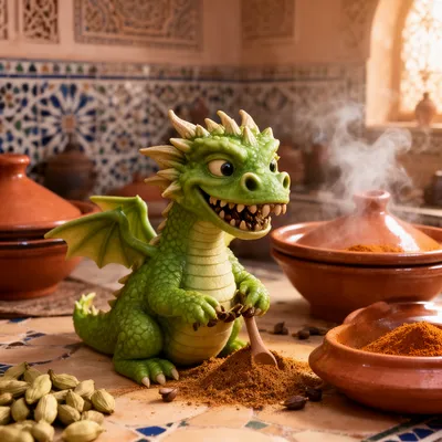 Whimsical AI-generated avatar of a green cardamom dragon chef creating spices in a vibrant Moroccan kitchen with intricate design details.