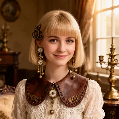 Elegant AI-generated steampunk avatar of a young blonde woman with brass clockwork earrings and vintage Victorian style portrait design.