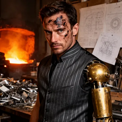 SteampunkDynamic AI-generated steampunk avatar of an eccentric male engineer with brass prosthetic arm, grease-smudged features, and intense creative energy in workshop setting.
