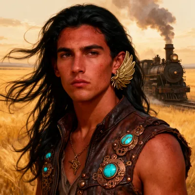 SteampunkImmersive steampunk-inspired AI avatar featuring a reddish-brown skinned man with brass details, leather vest, and industrial background creating a captivating character design.