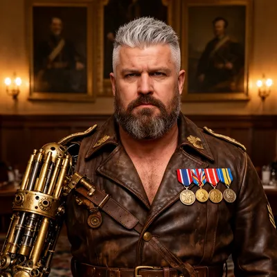 SteampunkDetailed AI-generated steampunk avatar of a rugged veteran with brass prosthetic arm and vintage military aesthetic, perfect for profile images.