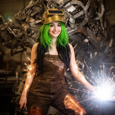 Bold steampunk avatar of a young female welder with green hair, brass mask, and leather jumpsuit showcasing industrial creativity and powerful feminine design.
