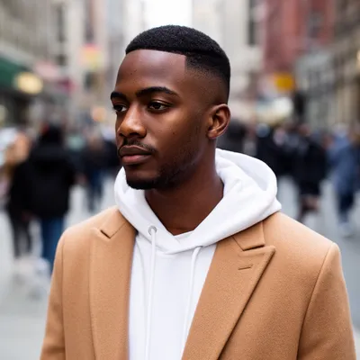 RealisticHigh-quality AI-generated avatar of a confident young Black man with perfect fade haircut, street-inspired urban style in white hoodie and camel overcoat.
