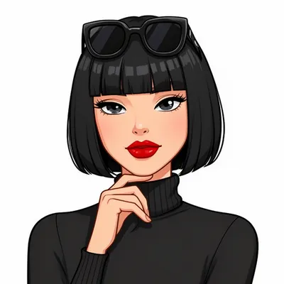 Bold cartoon-style AI avatar featuring a trendy woman with sleek black bob, red lipstick, and oversized sunglasses in a confident minimalist pose.