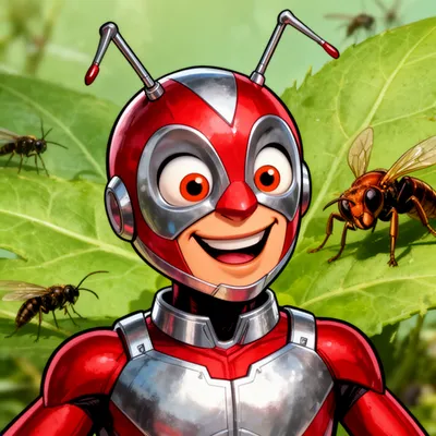 SuperheroesPlayful comic-style superhero avatar featuring a cheerful red and silver ant-inspired character with expressive eyes and goofy grin in macro insect world.