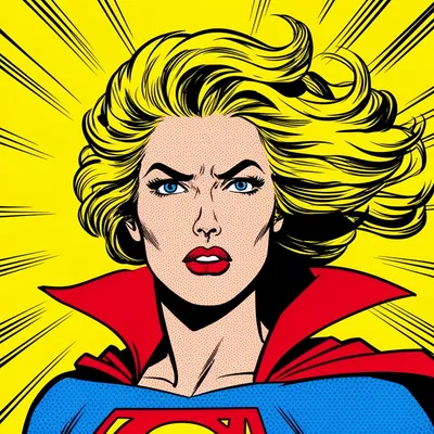 Pop ArtDynamic Lichtenstein-inspired pop art avatar with windswept superhero woman, vibrant halftone colors, comic book graphic style perfect for creative profiles.