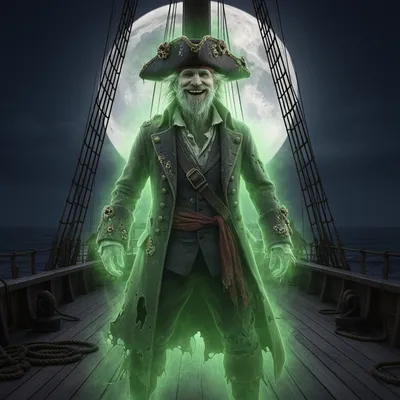 Haunting supernatural 3D render of a translucent pirate captain with ethereal green glow, perfect for spooky digital profiles and fantasy avatar collections.
