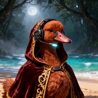 Unique AI-generated furry swan avatar with russet fur, velvet cloak, and tactical headset, blending mystical fantasy and modern digital style.