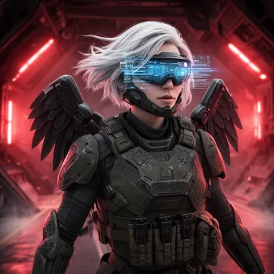 3D RenderHigh-tech futuristic military female avatar with platinum hair, tactical armor, wing jet pack, and combat visor in dramatic sci-fi 3D render style.