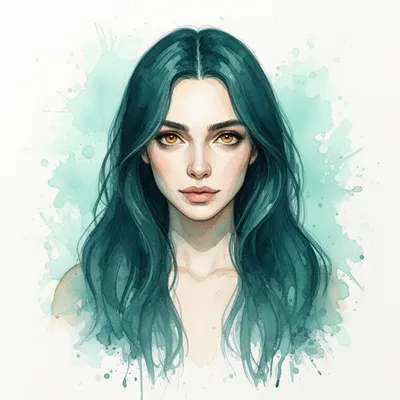 WatercolorEthereal AI-generated watercolor avatar featuring a woman with deep teal hair, mesmerizing hazel eyes, and delicate mint and aqua paint splashes on white background.