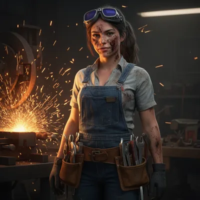 3D RenderRealistic 3D render avatar of a confident female mechanic with industrial styling, grease smudges, welding goggles, and dynamic lighting.
