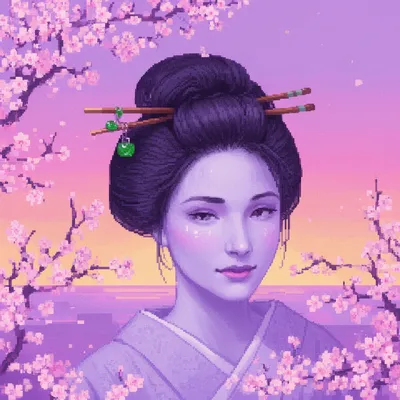 Elegant AI-generated avatar featuring a woman in pale lavender makeup with jade chopsticks, pixel art cherry blossoms, and nostalgic 80s digital art style.