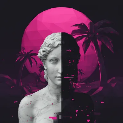 VaporwaveStunning AI-generated avatar blending marble statue aesthetics with retro-digital textures, featuring high-contrast neon magenta and black geometric design.