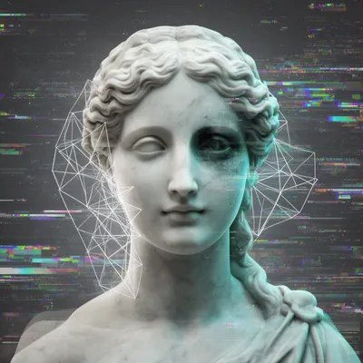 Ethereal AI-generated avatar blending marble statue aesthetics with glitching vaporwave style, featuring geometric wireframes and nostalgic digital textures.