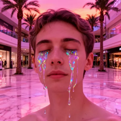 Iridescent digital portrait with serene expression and vaporwave-style liquid tears, capturing nostalgic 80s aesthetic in a surreal mall backdrop.
