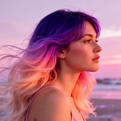 AI-generated female avatar featuring ethereal vaporwave aesthetic with windswept gradient hair transitioning from purple to pink, illuminated by warm sunset tones.