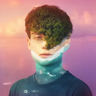 Surreal AI-generated vaporwave avatar blending human portrait with tropical island landscape in dreamy warm aesthetic, perfect for digital art enthusiasts.