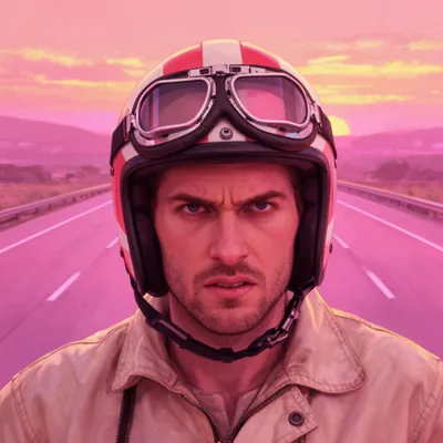 VaporwaveNostalgic AI-generated avatar featuring a vintage racing driver with retro helmet, sunset highway background, and vibrant vaporwave aesthetic.