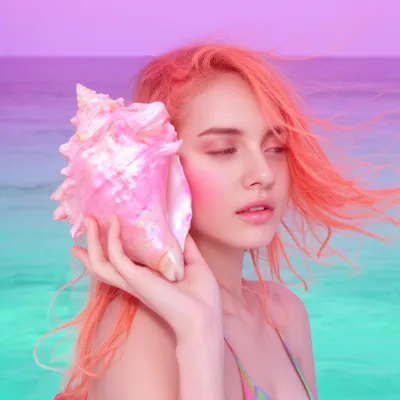 VaporwaveEthereal AI-generated vaporwave avatar featuring a woman with wind-blown hair, iridescent seashell, and soft pastel ocean gradient background.