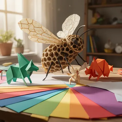 Intricate AI avatar featuring a wasp nest creature with hexagonal patterns, delicate papery wings, and origami-crafting detail in a vibrant creative studio setting.