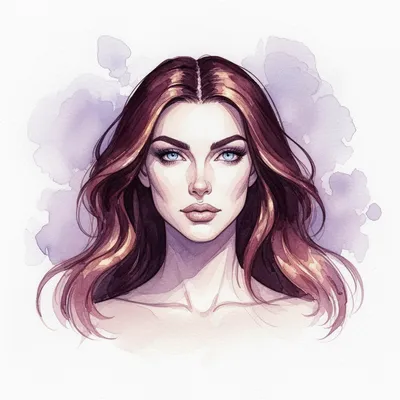 WatercolorSoft lavender watercolor AI-generated portrait featuring a regal woman with rose gold hair and piercing blue eyes on a delicate white background.