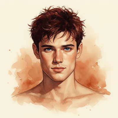 WatercolorExpressive watercolor AI avatar featuring a confident young man with messy auburn hair and deep blue eyes, perfect for digital profiles and creative portfolios.