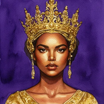 Majestic AI-generated watercolor portrait of a woman with intricate gold crown, featuring rich royal purple background and textured artistic style.