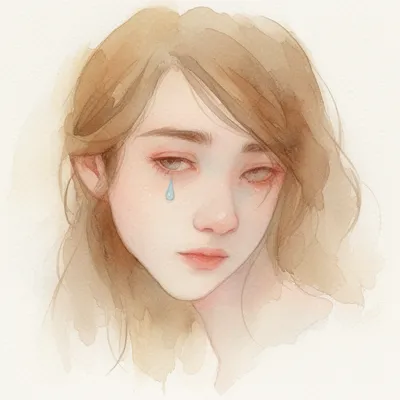 Delicate AI-generated watercolor avatar depicting a young woman with a subtle emotional tearful expression, rendered in soft warm tones and minimal artistic style.