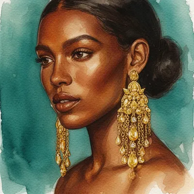 WatercolorStunning AI-generated watercolor avatar featuring a woman with intricate gold jewelry, rich brown skin tones, and teal background in delicate artistic style.